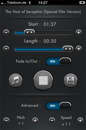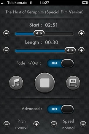 Der RingtonMaker Pro erlaubt auch eigene Kreationen, die über "Advanced" (beim Erstellen des Klingeltons) generiert werden können. Die Punkte "Pitch" und "Speed" erlauben ein Modifizieren des Sounds, so dass lustige Musikstücke entstehen können.
