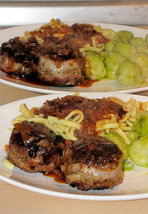 Die Spiesschen vor dem Anrichten entfernen. Dazu gab es Spätzle und Rosenkohl.