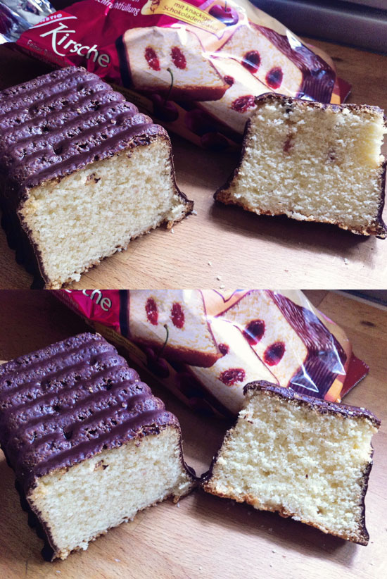 Nachdem wir den halben Kuchen weg hatten (ohne eine Spur von Kirschfüllung), MUSSTE ich ein Foto machen, denn auf Bild 1 liess sich besagte Kirschfüllung sehen und war dann auch schon so gut wie verschwunden (im Reststück zu sehen). Ob ich tatsächlich mal beim Hersteller nachfrage?