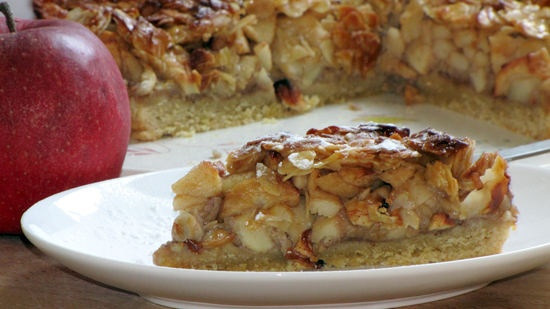 Für die Nusscreme wird weiche Butter mit dem Zucker, Ei und den Nüssen verrührt. Die Masse dann auf dem gekühlten Mürbteigboden verstreichen und mit den Biskuitbröseln bestreuen. Die Apfelstücke darauf verteilen.