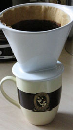 Heute morgen sollte es "frisch aufgebrühter Kaffee" sein. Mein Inneres schrie danach. Kein Senseo - nein danke! Ich war erstaunt, dass ich "wie berechnet" das Wasser aufgegossen habe. Fürs Foto hätte ich eine andere Tasse wählen sollen - z.b. eine weiße Tasse ;-) - passend zum Kaffee-Filter... hmm... egal. Anders schmecken würds auch nicht.