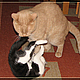 Florentinchen ist eine ausgesprochen zutrauliche kleine Dame mit sehr viel Selbstbewußtsein und einem starken Willen. Ich war überrascht, dass sie bis jetzt noch nicht einmal versucht hat, sich zu verstecken. Als ich sie aus ihrem Caddy geholt habe, ist sie freudig durch die Zimmer gejuckelt und hat alles neugierig untersucht. Sie war präsent von der ersten Minute an. Die ersten Stunden gehörten dem Entdecken und in dieser Zeit war sie noch nicht gewillt zu mir zu kommen. Das änderte sich schlagartig, als ich am Abend auf der Couch lag. Ich dachte, sie schmust mich nieder :-))) und wie mir scheint ist sie inzwischen auch schon so richtig zu Hause. Sandy reagiert prima. Gestern wurde noch mehrmals gefaucht, zwei drei Backpfeifen mußte die Kleine einstecken, aber heute ist bereits alles ruhig. Sandy entspannt sich zusehends. Für ihn ist die neue Situation schwerer zu verarbeiten, als für Florentinchen. Sie freut sich kleinkindmässig über das Leben und ist völlig unbedarft. Florentinchen ist sozusagen total unkompliziert und was mich besonders freut: die gesamte Eingewöhnung und das Kennenlernen ist viel einfacher als gedacht.