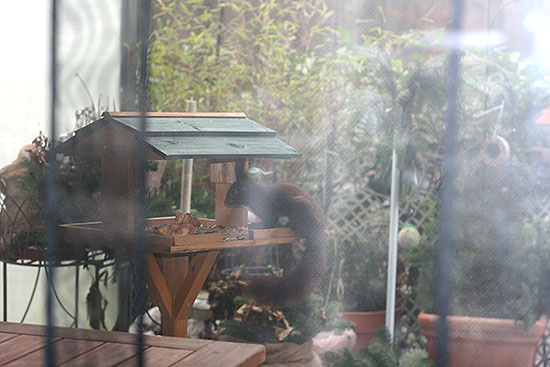 Und heute... es pumpert, ich schau.. Flori ganz aufgeregt: ein Eichhörnchen im Vogelhäuschen. Leider hat die Eile das Bild verdorben.. naja und der Fliegenvorhang, draussen vor dem Fenster, der war dem Bild auch nicht sonderlich zuträglich. Leider hat es uns dennoch entdeckt und hoppelt gleich darauf aufgeregt über die Terrasse davon um zwischen den Büschen zu verschwinden.
