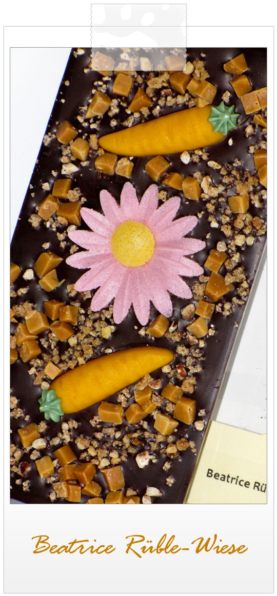 Meine Schoggi lief unter dem "Arbeitstitel" BEATRICE RÜBLI-WIESE :-): zartbitter Schokolade, Karamell, Krokant und Karamellstückchen, Marzipan-Rüblis und ein hübsches Blümchen. Ich habe ein herrliches Genusspaket bekommen. Wie schon oben geschrieben, wurde es mir noch vor Ostern überreicht. Die Wiese ist leider schon abgemäht - sie war lecker, lecker, lecker!