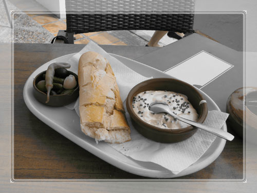 Das ist keine einfache Angelegenheit und birgt ausserdem Gefahren in sich, aber gut, ich wollte nicht nein sagen - ist es doch auch zum Wohle anderer... Gestern im Örtchen Cala Ratjada ein nettes kleines Lokal direkt am Meer... auf der Karte ABO - ausgeschrieben Aioli, Brot und Oliven... tja, und ich habe mich selbst zur Testerin ernannt. Meine Waage wird sich mächtig beschweren, aber wie schon oben geschrieben: ich mach das nicht nur für mich ;-))