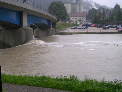 An der Staustufe wird fleissig Angeschwemmtes rausgebaggert, damit das Wasser ungehindert abfliessen kann.