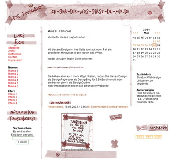 Beatrice 26.08.2009, 08.55| (3/0) Kommentare (RSS) | TB | PL | einsortiert in: Bea-Web | Blog4Swap, bloggen, tauschen, mitmachen, Aktion, Gratisblog,