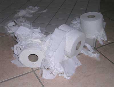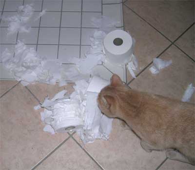 Seit einer Woche sammel ich nun zerfetzte - noch komplett neue - Klorpapierrollen zusammen - obiges Bild zeigt das h e u t i g e Ergebnis von einem unbeachteten Augenblick.