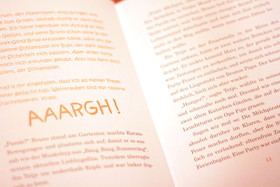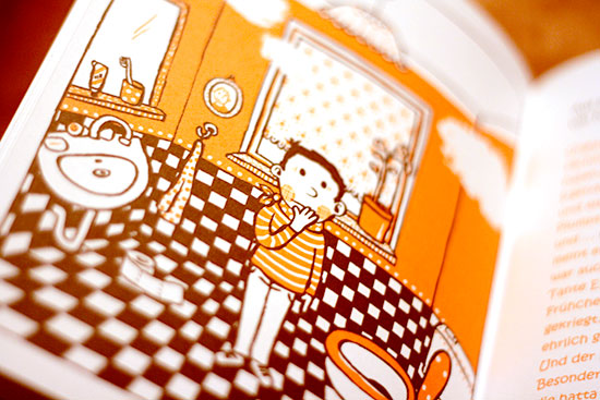 Ich bin ein großer Freund von Reimen. Reime prägen sich schnell und leicht ein und animieren zum Mitsprechen. Auf diesem Weg findet schneller eine Interaktion des Kindes statt. Auf jeder Seite des Buches wird z.B. das letzte Wort durch ein Bild ersetzt, welches sich einmal durch die Reimform, aber auch bildhafte Darstellung des Wortes, leicht durch das Kind finden lässt. Die kleinen Reime, auf jeder Seite des Buches, lassen die Geschichte kurzweilig erlebbar machen. Ernsten Themen begegnet man am besten mit Humor und der kommt bei Finn Vogelschreck weder im Bild noch im Wort zu kurz.